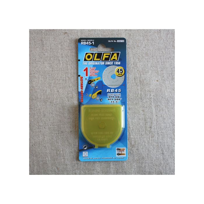 Rotary cutter replacement blade for Olfa 45mm cutters. Comes in protective case.